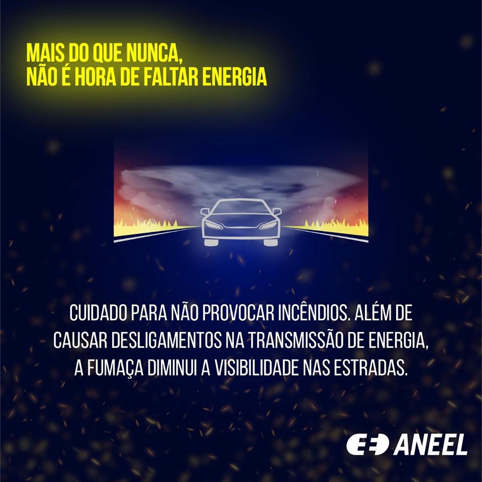 Você sabia que queimadas irregulares são um risco para a segurança de motoristas? A visibilidade das pistas, dentro da cidade ou nas estradas é diminuída pela fumaça. Nesta época de seca, a ANEEL alerta para o risco de queimadas irregulares.
