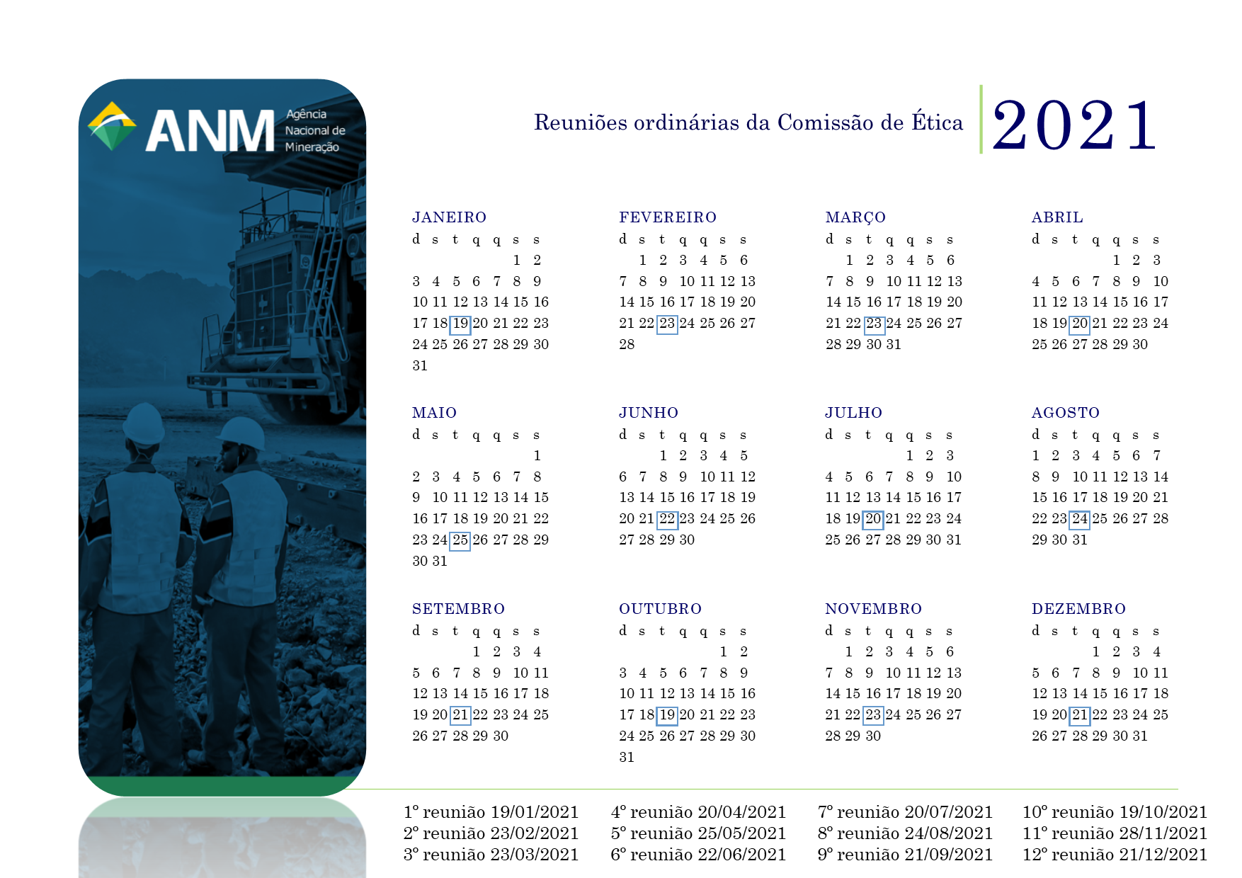 Calendário das reuniões ordinárias da Comissão de Ética da ANM