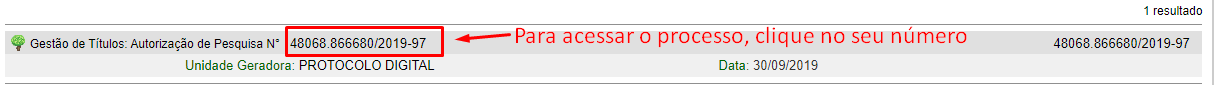 3º Existindo o processo para o número informado, será apresentado abaixo dos campos da Pesquisa Pública, o resultado da busca conforme tela abaixo. Para acessar o processo, clique em seu número