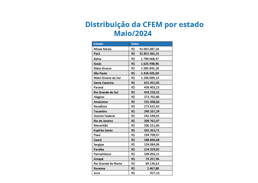 Os estados que mais receberam recursos da CFEM foram Minas Gerais (mais de R$ 41 milhões) e Pará (aproximadamente R$ 33 milhões). Confira a distribuição por estado: