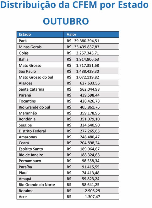 Os estados que mais receberam recursos da CFEM foram Pará (mais de R$ 39 milhões) e Minas Gerais (mais de R$ 35 milhões). Confira a distribuição por estado:
