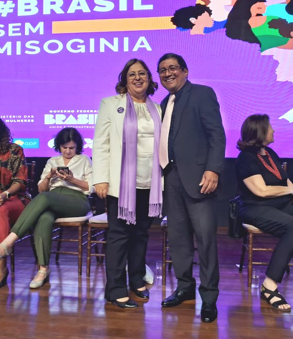 Sousa, da ANM, e a ministra Cida, das Mulheres, no lançamento da Iniciativa Brasil Sem Misoginia