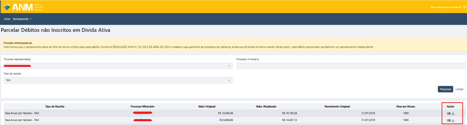 Solicitação de Parcelamento