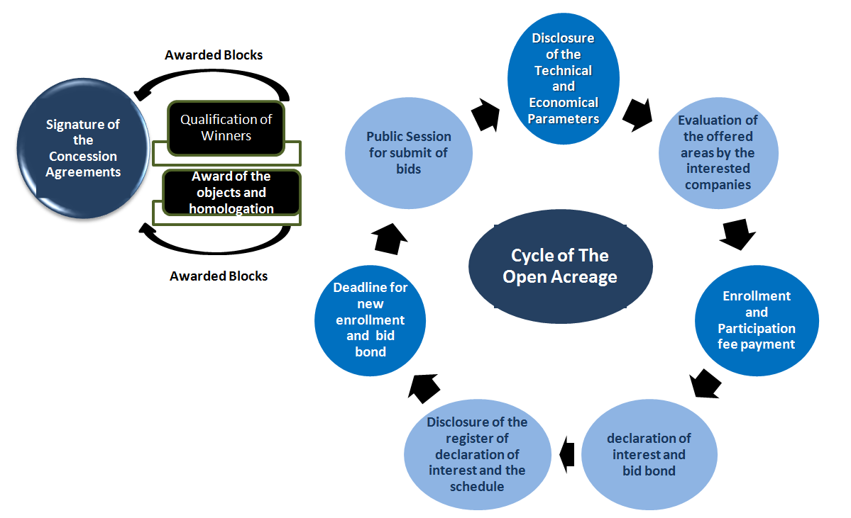 A cycle of Open Acreage of Concession will start after the approval of at least one declaration from the sectors of interest accompanied by a guarantee of offer.