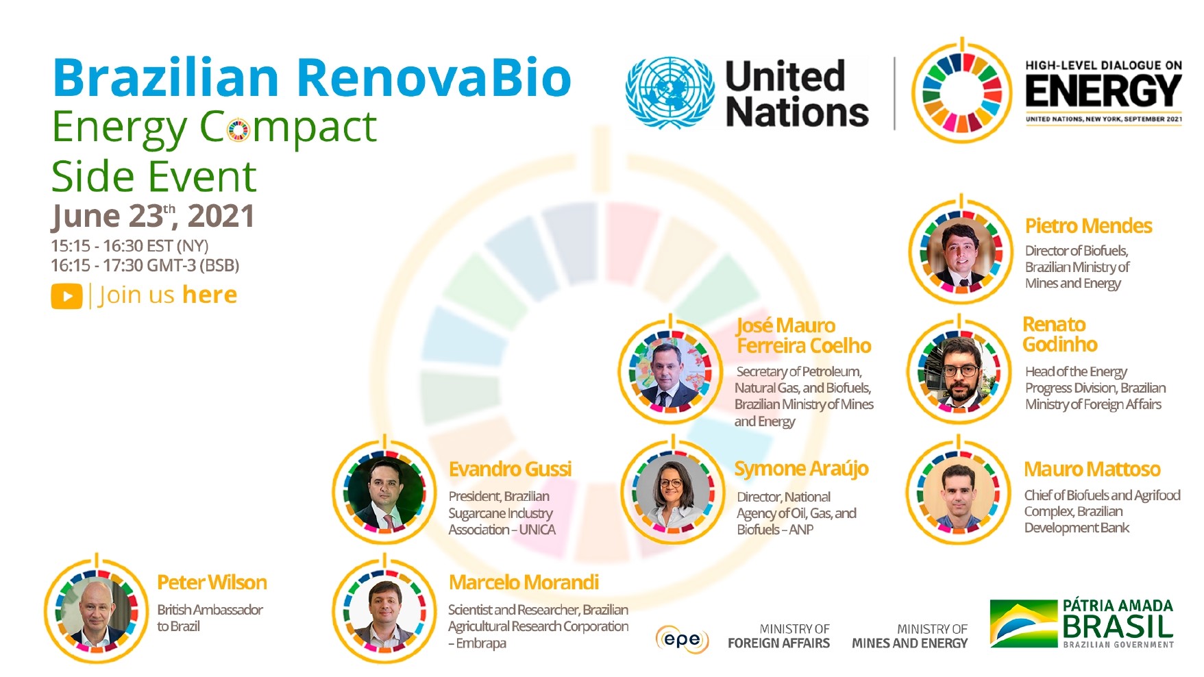 O Brazilian RenovaBio é Parte dos eventos de lançamento dos “pactos energéticos” (energy compacts), a serem apresentados pelo governo brasileiro no âmbito do Diálogo em Alto Nível de Energia das Nações Unidas, para acelerar a ação em direção ao cumprimento das metas do Objetivo de Desenvolvimento Sustentável 7 - ODS 7.