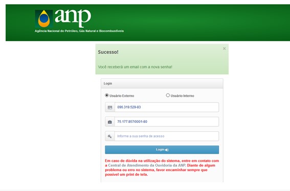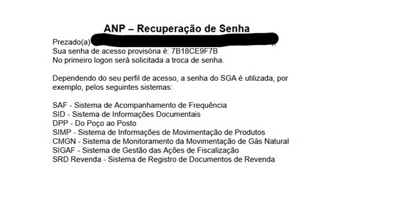O sistema então irá enviar um e-mail para o e-mail listado no cadastro do usuário. Esse e-mail de alteração de senha pode vir como SPAM, cair no lixo eletrônico ou mesmo ter o recebimento bloqueado pelo e-mail da empresa. Ele tem o título: “Fwd: ANP? Confirmação de recuperação de Senha”