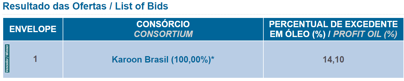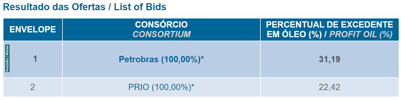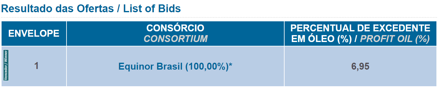 Foram arrematados 5 blocos exploratórios, localizados nas bacias de Santos e Campos. O total de bônus ofertado foi de R$ 103.728.181,09 e a previsão do investimento mínimo na fase de exploração é de R$ 451.498.600,00.