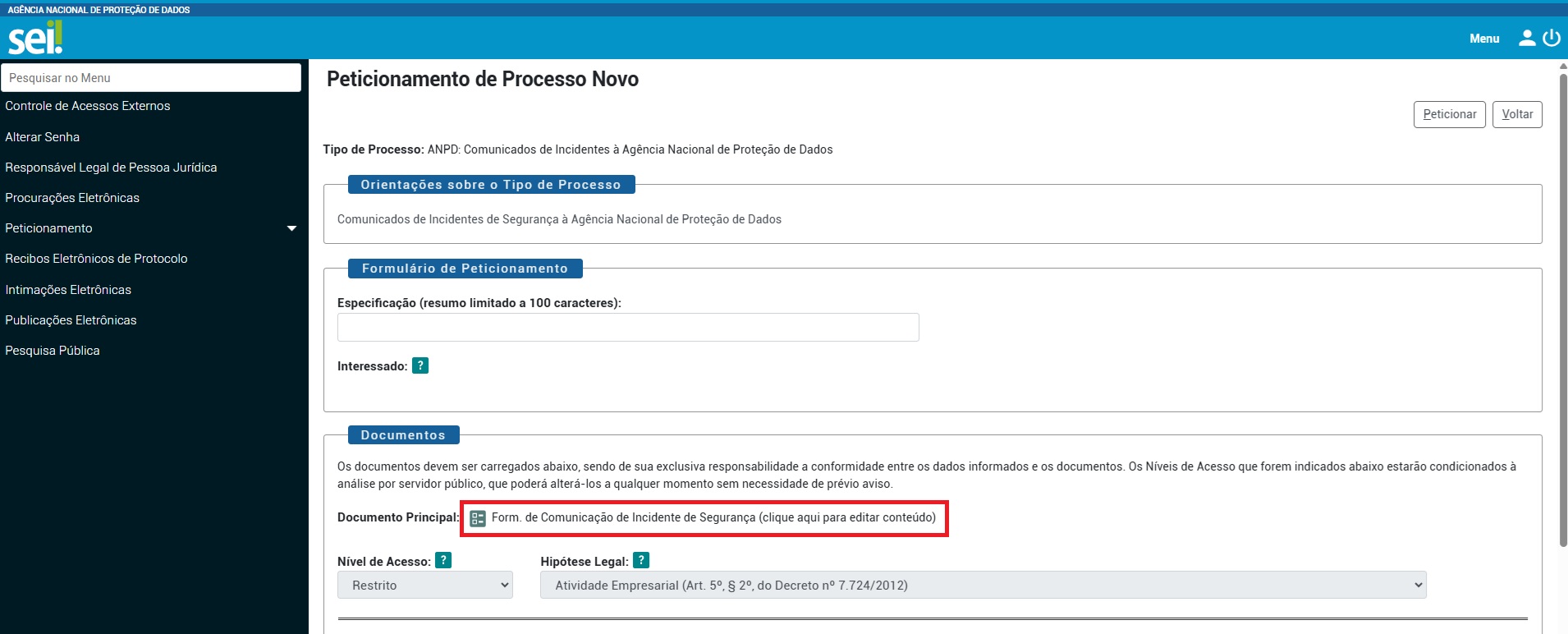 4. Clique e preencha o formulário de incidente de segurança – preliminar ou completo – que aparece em "Documento Principal".