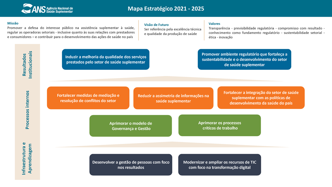 O Plano Estratégico da ANS 2021-2025 é representado pelo Mapa Estratégico, que traduz a missão, a visão e a estratégia da organização em um conjunto abrangente de objetivos que direcionam o comportamento e o desempenho organizacionais. Os objetivos estratégicos são os fins a serem perseguidos pela organização para o cumprimento de sua missão institucional e o alcance de sua visão de futuro. Constituem o elo entre as diretrizes de uma organização e seu referencial estratégico.