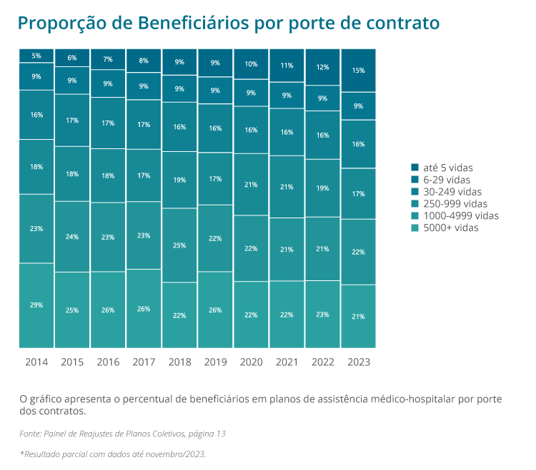 Proporção de beneficiários por contratação em planos de assistência médica