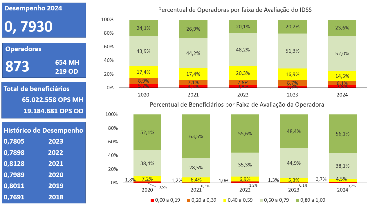 O Painel é composto por um conjunto de indicadores que compõem o IDSS das operadoras e apresenta os resultados por indicador e por operadora dos últimos 5 (cinco) anos. Podem ser conferidos também os resultados do IDSS Geral do setor, desagregado por segmento, modalidade e porte.