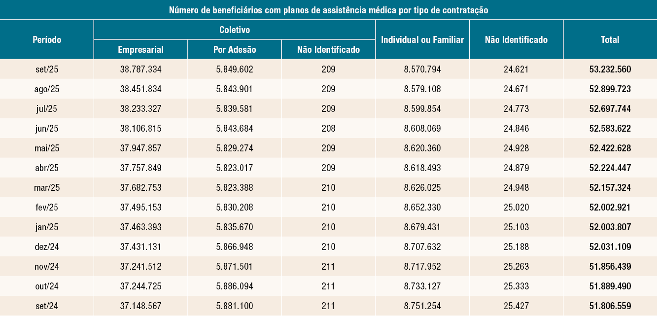 A Agência Nacional de Saúde Suplementar (ANS) disponibilizou em seu portal os números de beneficiários de planos de saúde referentes a setembro de 2025. Neste período, o setor registrou 53.232.560 de usuários em assistência médica e 34.910.516 em planos exclusivamente odontológicos. Esses e outros dados podem ser conferidos na Sala de Situação.