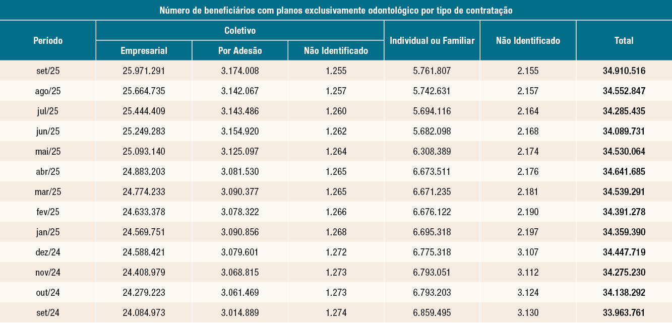 Nos planos exclusivamente odontológicos, 946.755 beneficiários incrementaram o setor em setembro deste ano, se compararmos com o mesmo mês em 2024. De agosto para setembro de 2025, a saúde suplementar conquistou mais 357.669 beneficiários.