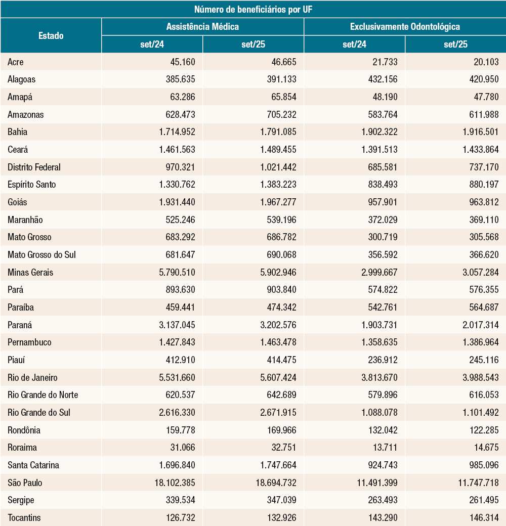 Já nos estados, no comparativo com setembro de 2024, o setor registrou evolução de beneficiários em planos de assistência médica em todas as unidades federativas. Entre os odontológicos, 21 unidades federativas registraram crescimento no comparativo anual.