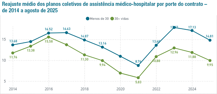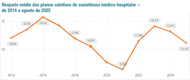 O reajuste médio aplicado aos contratos coletivos de assistência médico-hospitalar de janeiro a agosto de 2025 foi de 11,15%, apresentando leve redução em relação ao reajuste médio do ano anterior.