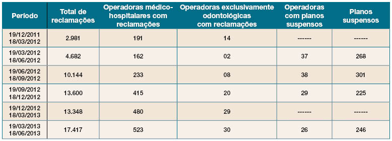 Este resultado é referente ao período entre 19 de março e 18 de junho de 2013. Das 553 operadoras com pelo menos uma reclamação sobre o não cumprimento dos prazos máximos para atendimento ou de outro tipo de negativa de cobertura registradas nesses três meses, 523 são operadoras médico-hospitalares e 30 estão voltadas à assistência exclusivamente odontológicas.