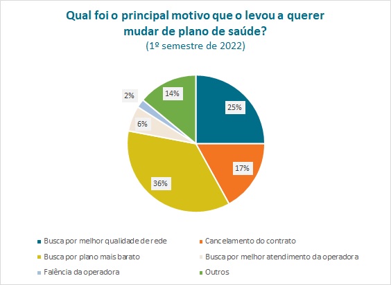 De janeiro a junho de 2022, os principais motivos informados pelos beneficiários quanto ao interesse na portabilidade de carências foram: a busca por um plano mais barato (36%), a procura por melhor qualidade da rede prestadora (25%) e cancelamento de contrato (17%), como pode ser visto no gráfico abaixo.