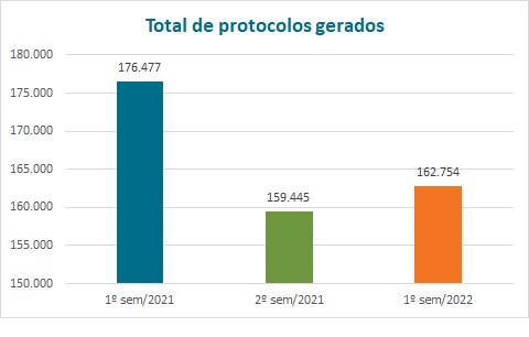O total de protocolos emitidos no primeiro semestre deste ano foi 2,1% maior (3.309) que o total gerado no segundo semestre de 2021 e 7,8% menor que o total de protocolos emitidos no primeiro semestre de 2021. Importante destacar que o número de protocolos emitidos representa o total de consultas finalizadas no Guia ANS e não o número de portabilidades de carência efetivadas.