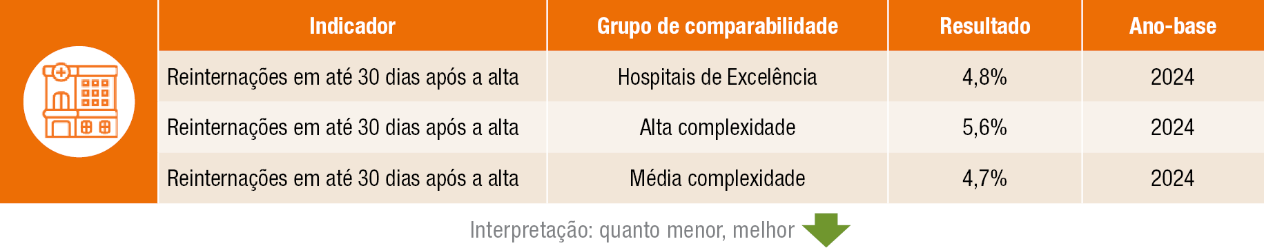 Reinternação em até 30 dias pós alta – avalia a qualidade e efetividade do cuidado prestado ao paciente. Altas proporções de reinternações podem sinalizar problemas como alta hospitalar inadequada, falhas no plano terapêutico, insuficiência na orientação ao paciente e à família, dificuldades na articulação com a atenção ambulatorial ou complicações evitáveis relacionadas à assistência prestada durante a internação.