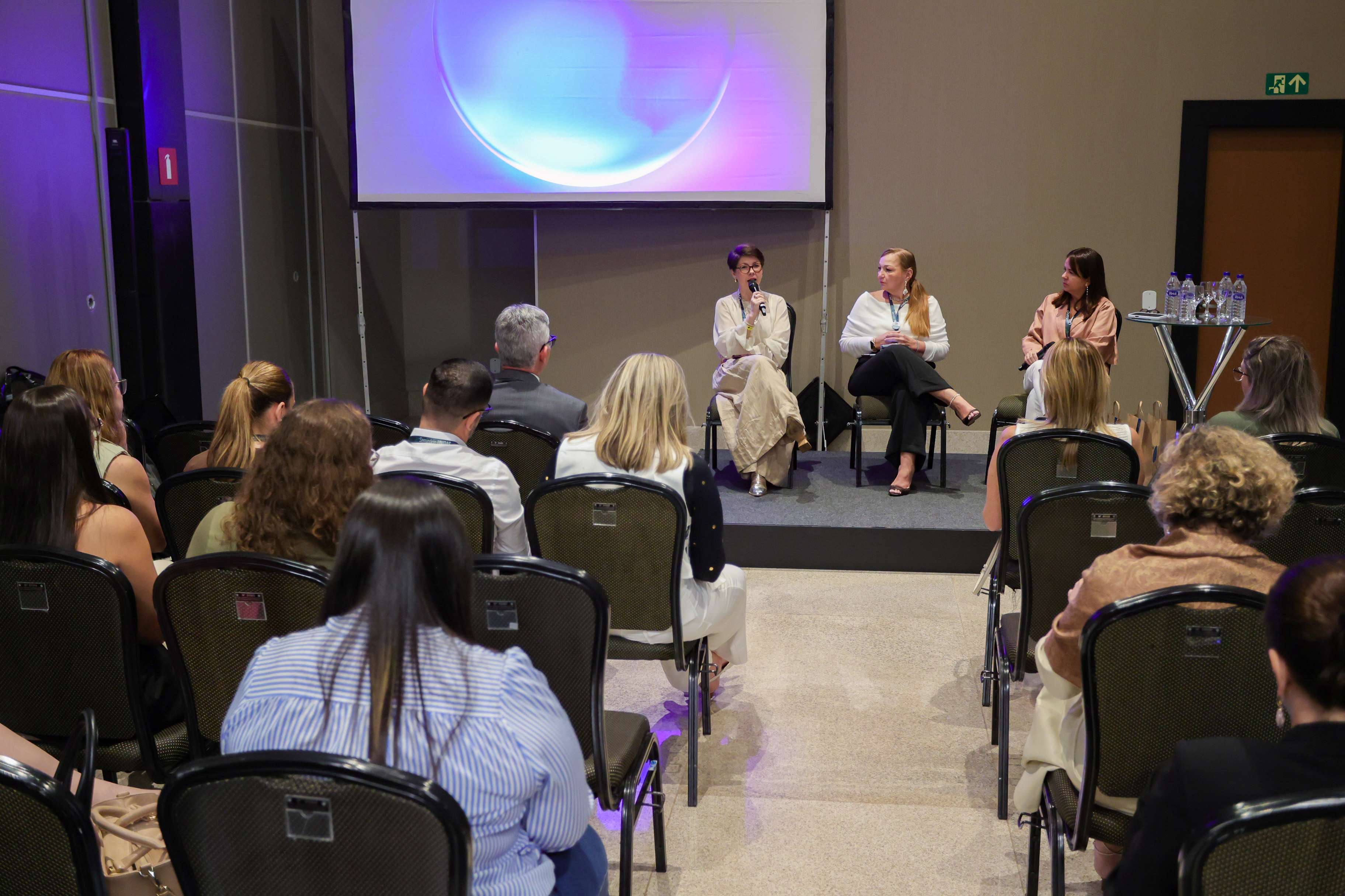 A diretora-adjunta de Normas e Habilitação dos Produtos da ANS, Dominic Lourenço, ao lado de Athina Luiza Bamihas, responsável técnica da FAPES/BNDES, e Emanuella Faheina Chaves Caminha, diretora do grupo Camed, durante a oficina “Visão estratégica para sustentabilidade em odontologia”, realizada no 17º Seminário Unidas