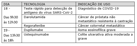 A Agência Nacional de Saúde Suplementar (ANS) irá realizar, no dia 18, das 9h30 às 12h30, e no dia 19/01, das 13h30 às 18h, a primeira reunião técnica da Comissão de Atualização do Rol de Procedimentos e Eventos em Saúde Suplementar (Cosaúde). O objetivo do encontro é discutir a inclusão de tecnologias submetidas para análise da Agência na lista de coberturas obrigatórias dos planos de saúde, conforme tabela abaixo: