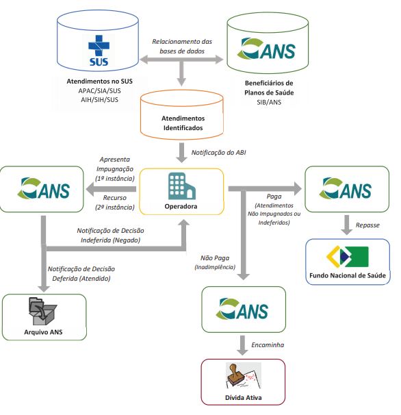 Após a checagem, uma vez identificado que beneficiários utilizaram os serviços do SUS, são encaminhadas às operadoras de planos de saúde notificações, denominadas de Aviso de Beneficiário Identificado (ABI), para que efetuem o pagamento dos valores apurados ou apresentem defesa.