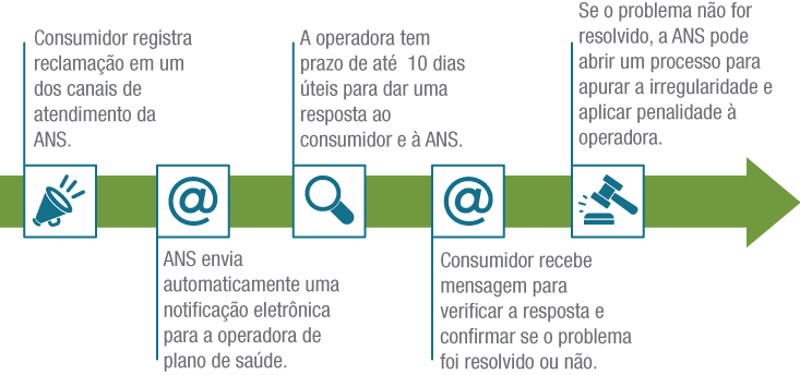 Imagem contendo o seguinte passo a passo: Consumidor registra reclamação em um dos canais de atendimento da ANS. ANS envia automaticamente uma notificação eletrônica para a operadora de plano de saúde. A operadora tem prazo de até 10 dias úteis para dar uma resposta ao consumidor e à ANS. Consumidor recebe mensagem para verificar a resposta e confirmar se o problema foi resolvido ou não. Se o problema não for resolvido, a ANS pode abrir um processo para apurar a irregularidade e aplicar penalidade à operadora.