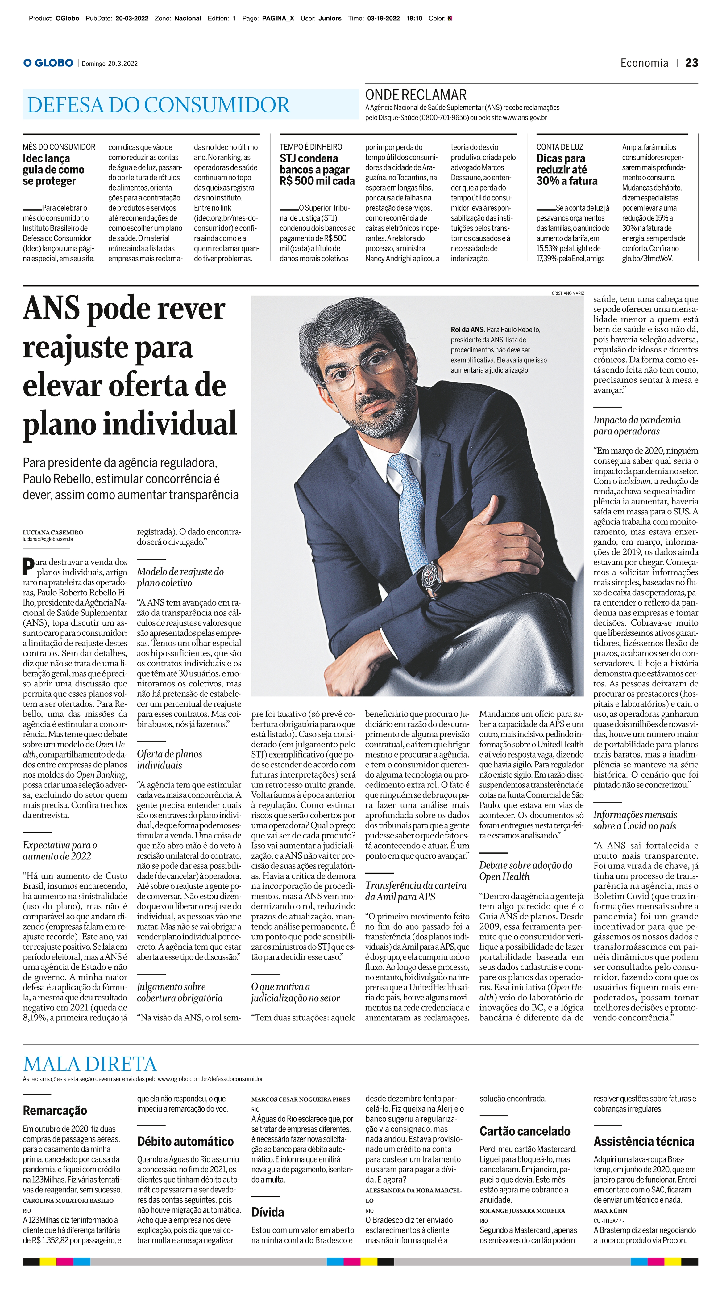 Em entrevista exclusiva para a coluna Defesa do Consumidor do jornal O Globo, publicada no dia 20/03, o diretor-presidente da ANS, Paulo Rebello, falou sobre a expectativa de reajuste dos planos individuais, o modelo de reajuste dos planos coletivos, a judicialização no setor, os impactos da pandemia para as operadoras e outros assuntos que permeiam a saúde suplementar.