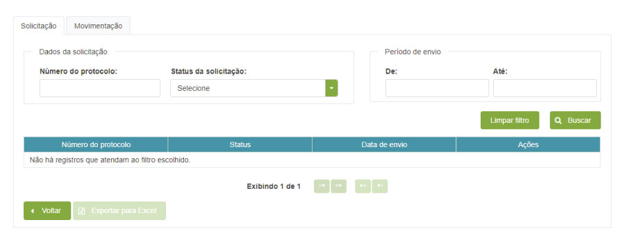 - Período de envio – permite a consulta por uma data ou um período de envio da solicitação.