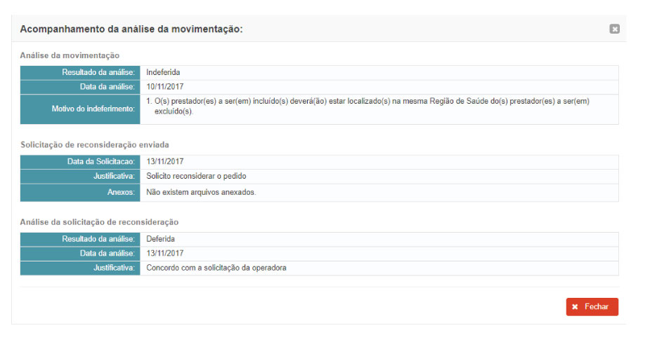 Nesta funcionalidade o sistema exibe todo o histórico das análises da movimentação: Resultado da análise da movimentação; Solicitação de reconsideração enviada e Resultado da análise da solicitação reconsideração, caso tenha sido solicitada.