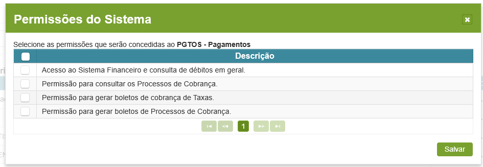 O representante seleciona o botão Detalhe na linha correspondente ao sistema Financeiro (opção: PGTOS – Pagamentos) e a tela abaixo aparecerá com a lista de permissões possíveis para o usuário. O representante legal deverá selecionar as opções de acesso do usuário e acionar o botão Salvar.