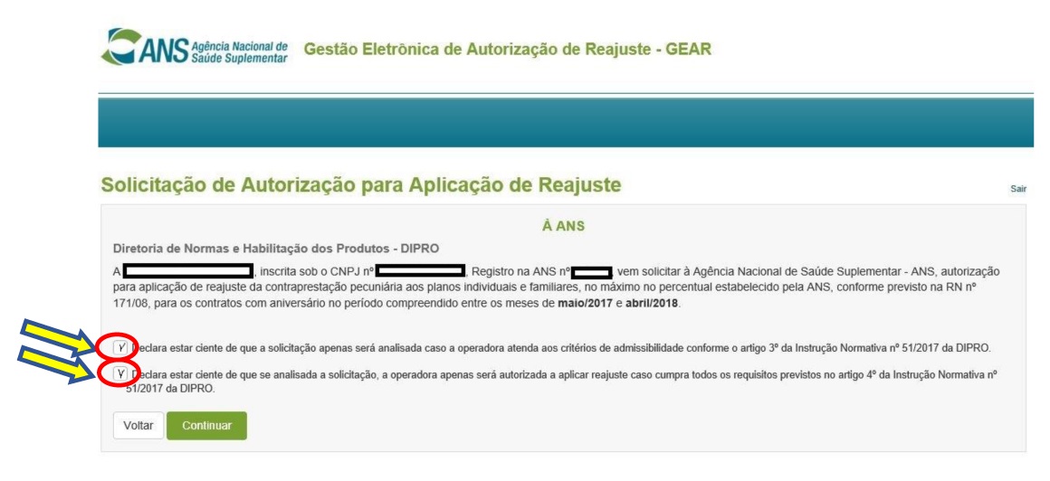 Na tela de solicitação de autorização para aplicação de reajuste, confirme as declarações de ciência.