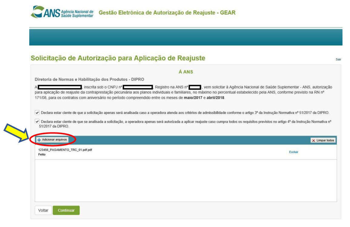 Após confirmar as declarações de ciência, será aberta a tela para anexar comprovante de pagamento da Taxa por Pedido de Reajuste de Contraprestação Pecuniária (TRC).