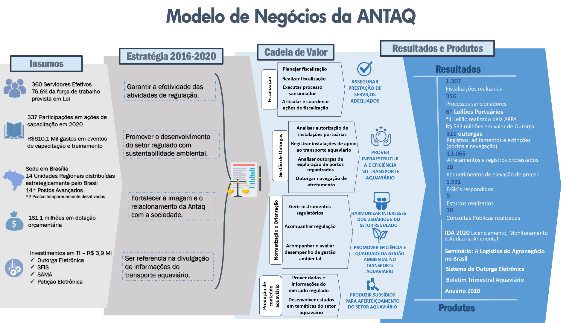 O modelo de negócios da Antaq é o instrumento de gestão que, em alinhamento à estratégia e à estrutura de processos de trabalho, demonstra como os insumos à disposição da agência geram os resultados percebidos tanto pelo público interno – os servidores – quanto pelo externo – a sociedade.