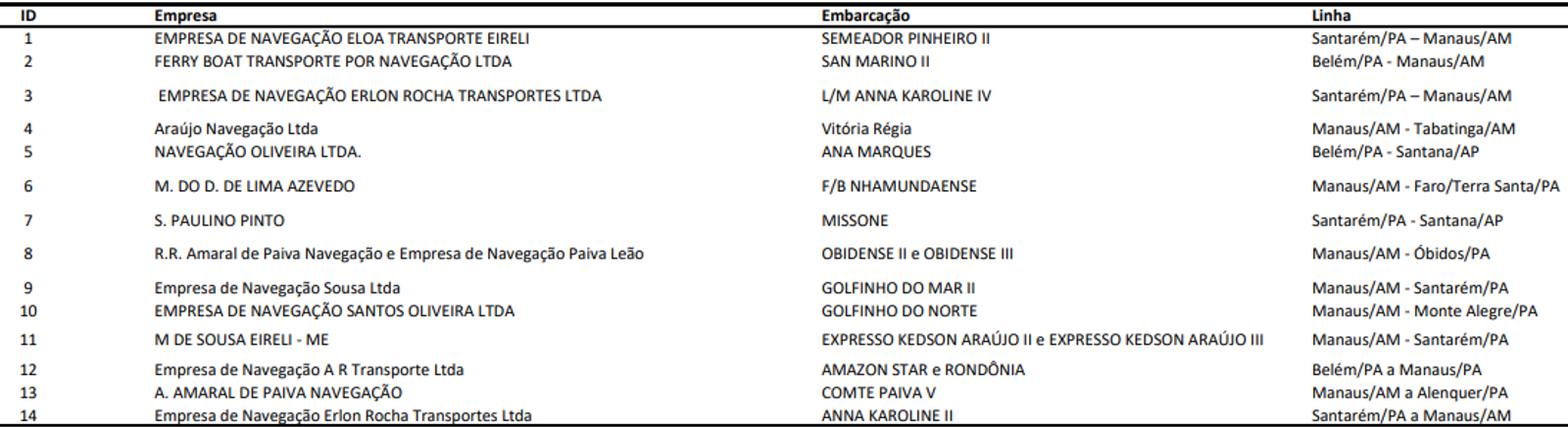 A Agência Nacional de Transportes Aquaviários – ANTAQ divulgou hoje (15) a relação das Empresas Brasileiras de Navegação (EBNs) que prestam serviços na navegação interior de transporte de passageiros e misto (cargas e passageiros) na Região Norte do país, e que tiveram seus esquemas operacionais alterados para atender ao aumento da demanda nos períodos que antecedem às comemorações do Natal e do Ano Novo.