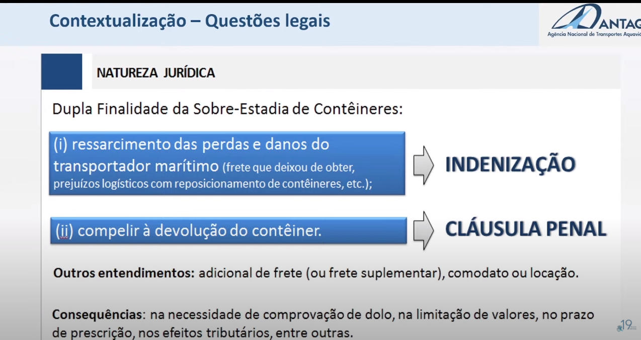 A Agência já regulou a matéria, por meio da Resolução Normativa nº 18/2017, e vem trabalhando na formulação de procedimentos metodológicos sistematizados que vão servir para análise de possíveis abusividades na cobrança de sobre-estadia de contêineres por parte dos transportadores marítimos. Em relação ao tema, previsto na sua Agenda Regulatória do período 2020/2021, a ANTAQ realizou a Tomada Pública de Subsídios nº 03/2020/SRG, encerrada em 03/11/2020; o Relatório de Análise de Impacto Regulatório - AIR preliminar; e a audiência/ consulta pública nº 13 – que prossegue em andamento até o dia 28/07/2021.