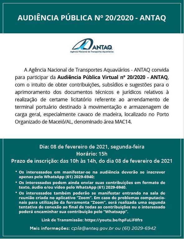 A audiência pública virtual integra a Consulta/Audiência Pública 20/2020 que está em andamento no portal da Agência na internet. As minutas jurídicas e os documentos técnicos estão disponíveis no endereço eletrônico: portal.antaq.gov.br/index.php/acesso-a-informacao/audiencia-publica-2/.