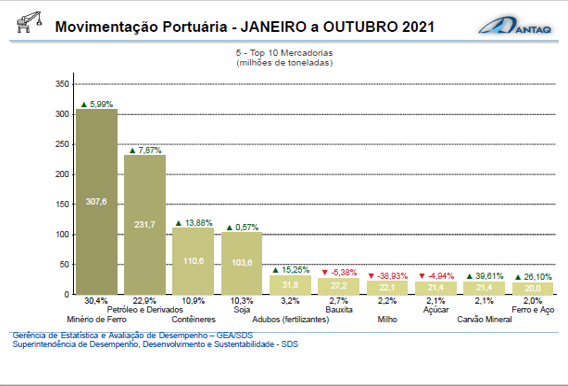 Entre as cargas mais movimentadas no período (jan/out), além dos contêineres, destaque para petróleo e derivados, que representaram 22,9% de toda a movimentação (231,7 milhões de toneladas), e crescimento de 7,9% em comparação com igual período de 2020; adubos (fertilizantes), com participação de 31,8 milhões de toneladas, crescimento de 15,3%; carvão mineral, que movimentou 21,4 milhões de toneladas, alta de 39,6%; e ferro e aço que registraram 20,0 milhões de toneladas movimentadas, elevação de 26,1%.