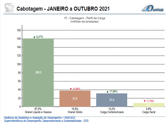 Entre as navegações, o longo curso, que representa 70,5% de toda movimentação portuária brasileira, apresentou crescimento de 6,0% até outubro de 2021 em comparação com igual período de 2021. A cabotagem geral cresceu 6,7%, sendo que a cabotagem de contêineres teve expansão de 18,0% em toneladas e 15,8% em TEU. Já a navegação interior registrou queda de 5,0% no período.