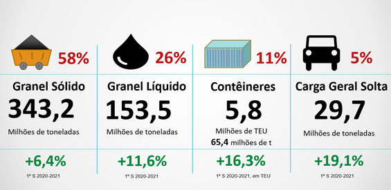 O minério de ferro foi a carga mais movimentada no primeiro semestre: 171,8 milhões de toneladas (crescimento de 12%). O petróleo apareceu na segunda posição: 97,2 milhões de toneladas (incremento de 8%). Soja, contêineres e derivados de petróleo também se destacaram.