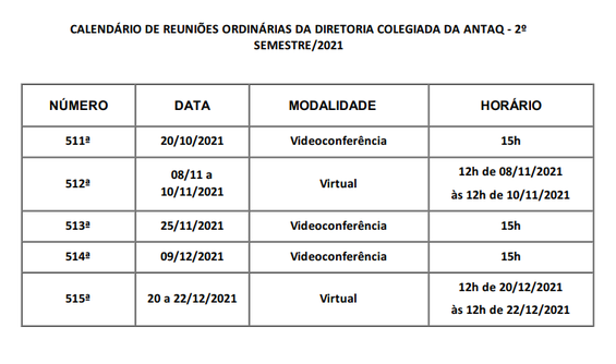 A ANTAQ divulgou novo calendário de Reuniões Ordinárias da Diretoria Colegiada referente ao 2º semestre de 2021. Confira abaixo:
