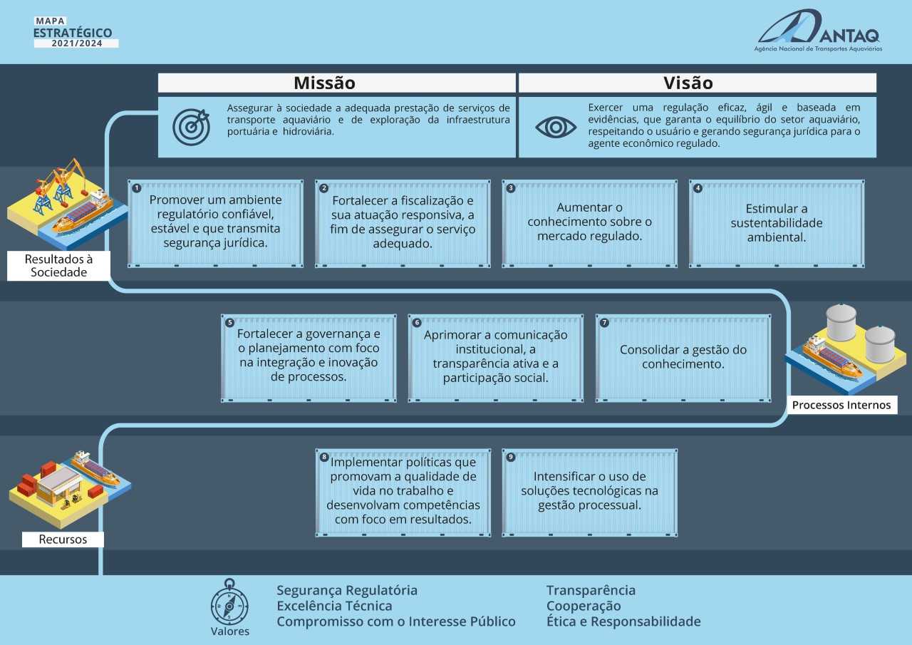 O Plano, como ferramenta de gestão, contempla os objetivos estratégicos para o quadriênio vindouro, de forma a cumprir a missão institucional da Agência de assegurar à sociedade a adequada prestação de serviços de transporte aquaviário e de exploração da infraestrutura portuária e hidroviária. Além disso, os objetivos estratégicos buscam alcançar a visão de futuro declarada do órgão, de exercer uma regulação eficaz, ágil e baseada em evidências, buscando o equilíbrio do setor aquaviário, respeitando o usuário e gerando segurança jurídica para o agente econômico regulado.