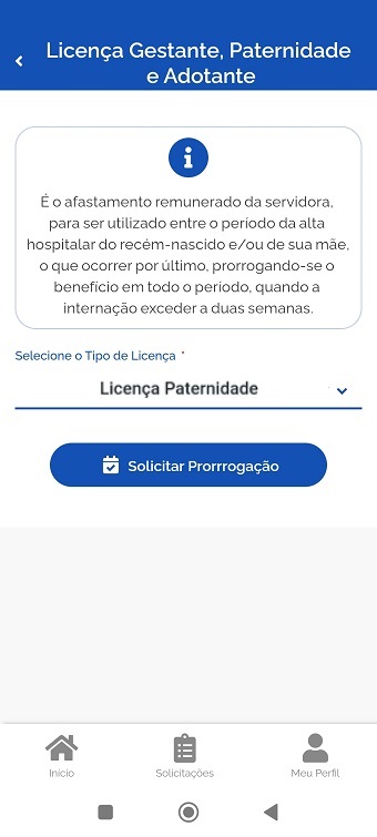 1º) Acesse o aplicativo SouGov e, na tela inicial, você já visualizará o item "Solicitações", onde são disponibilizados diversos serviços. Para iniciar a solicitação, clique em Licença Gestante, Adotante e Paternidade:Aparecerá a tela para você escolher a licença desejada. Selecione a opção "Licença Gestante":