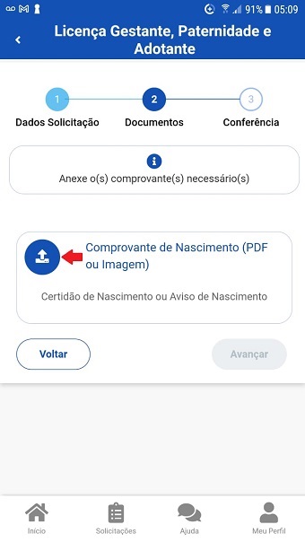 3) Clique no ícone de download e escolha o comprovante de nascimento, em seguida selecione o arquivo a ser anexado: