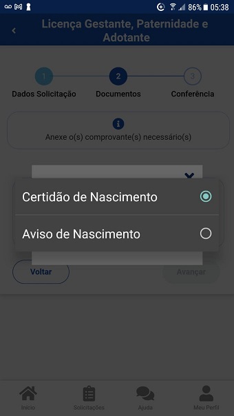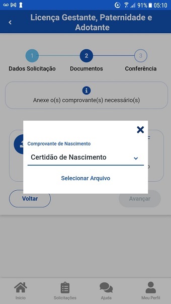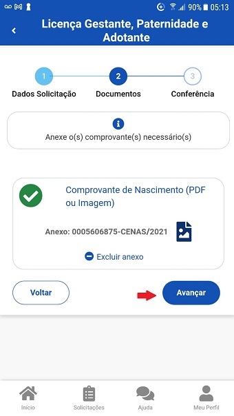 2) Informe somente a Data de início de Nascimento, pois o aplicativo, automaticamente, marcará a opção "Solicito prorrogação da Licença de mais de 15 dias, totalizando 20 dias". Clique em "Avançar":