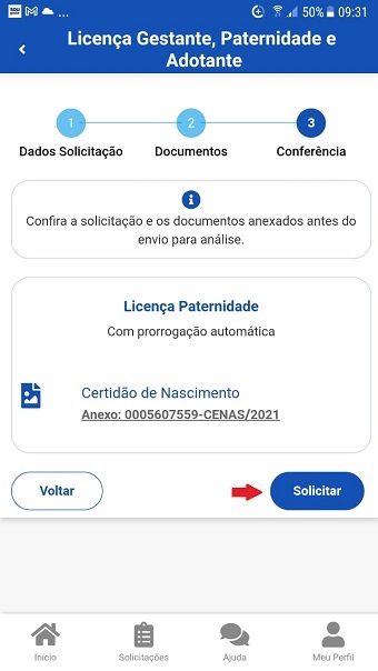 5) Confira se todos os dados estão corretos e se a documentação exigida foi anexada antes de clicar em "Solicitar":