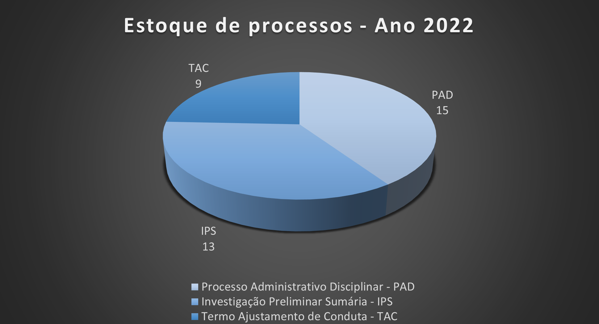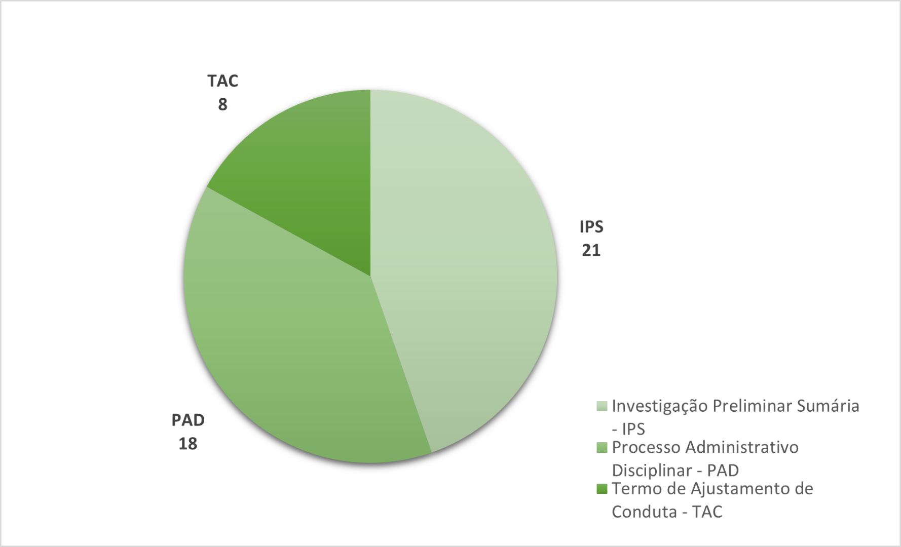 No início de 2022, se encontravam em andamento 2 Investigações Preliminares Sumárias, iniciadas no exercício de 2021. Um dos mencionados procedimentos resultou na celebração de 2 Termos de Ajustamento de Conduta – TAC, enquanto o procedimento restante culminou com a sugestão de instauração de Processo Administrativo Disciplinar – PAD, a ser autuado.