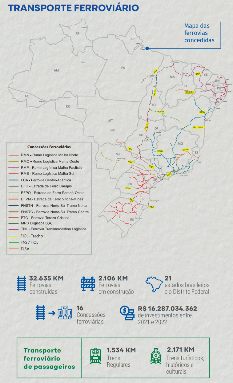 Atualmente, estão em andamento 6 projetos qualificados pelo PPI entre novas outorgas e prorrogações antecipadas de ferrovias, correspondendo aproximadamente à vultosa quantia de R$ 63 bi, com extensão de 20 mil km, em investimentos programados pelo Governo Federal: