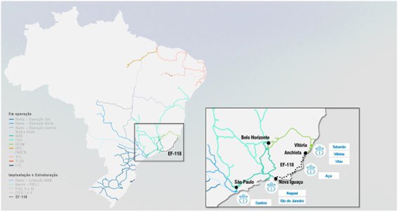 A ferrovia EF-118, com extensão de 575 quilômetros, está planejada para conectar o município de Nova Iguaçu, no estado do Rio de Janeiro (RJ), com o município de Santa Leopoldina, no estado do Espírito Santo (ES), promovendo a integração da malha ferroviária do Sudeste e garantindo o acesso ferroviário a importantes terminais portuários. Da sua extensão total, o trecho de 80km entre Santa Leopoldina e Anchieta deverá ser construído pela Vale, como contrapartida pela prorrogação antecipada das suas ferrovias, e passará a integrar o contrato de concessão da Estrada de Ferro Vitória-Minas (EFVM). O trecho de aproximadamente 170 km entre Anchieta e o Porto do Açu integrarão uma nova concessão, alvo deste estudo de viabilidade, a qual poderá contemplar ainda a construção do trecho de 325km entre o Porto do Açu e Nova Iguaçu. Este trecho está enquadrado na concessão como um investimento contingente, a ser realizado pela concessionária através de decisão unilateral do poder concedente, mediante reequilíbrio econômico-financeiro do contrato.