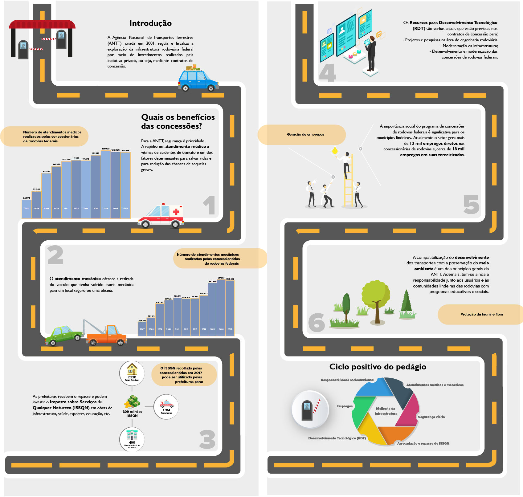 Em 2017, foram investidos cerca de R$ 5,6 bilhões em duplicações, manutenção e operação nas rodovias federais concedidas. Duplicação, iluminação,trevos, passarelas, recuperação dos taludes e do pavimento asfáltico são apenas alguns exemplos de obras que beneficiaram os usuários dos segmentos e a população dos municípios lindeiros.